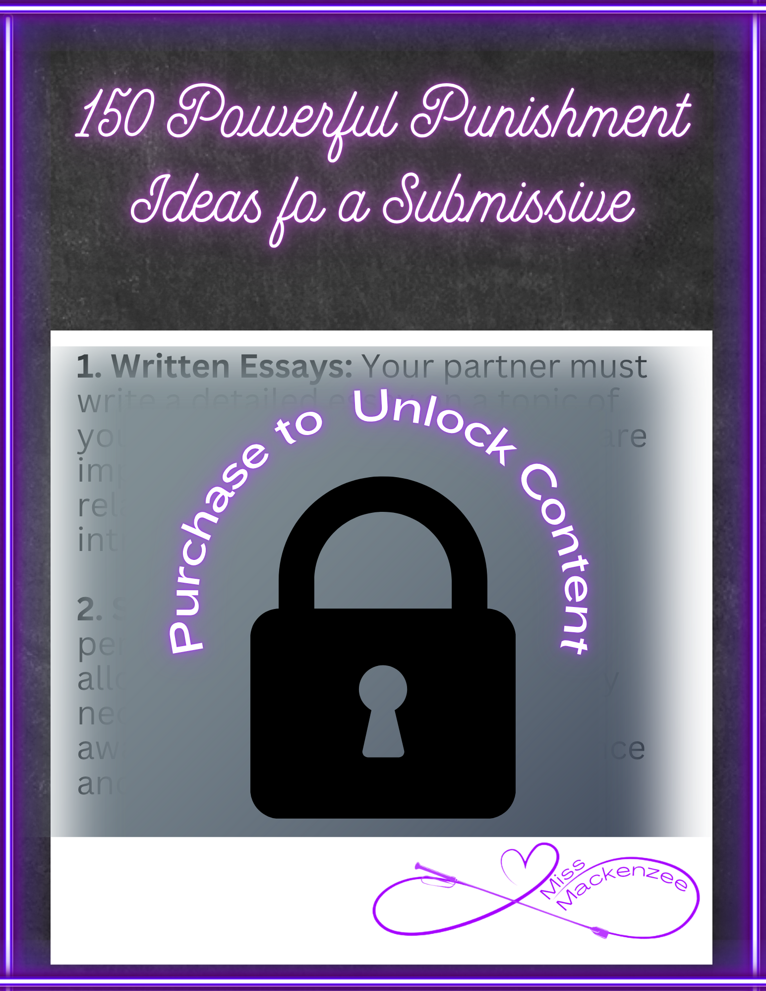 Unlock the depths of your dynamic with "150 Powerful Punishment Ideas for a Submissive." This 34 page digital download provides a treasure trove of creative and consensual punishment concepts designed to enhance your BDSM experience. Whether you’re an experienced Dominant or just starting your journey, this guide offers thought-provoking insights and practical ideas to deepen trust and communication between partners.