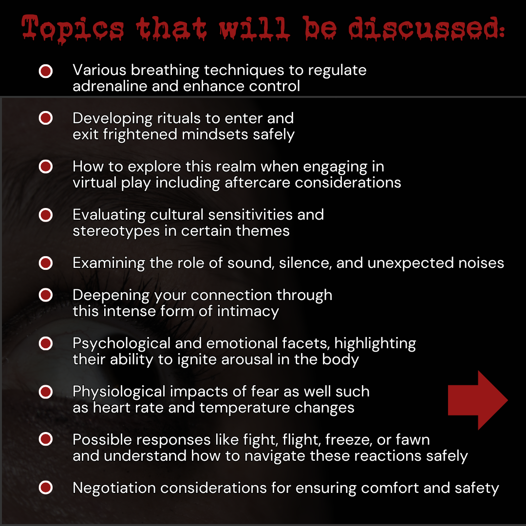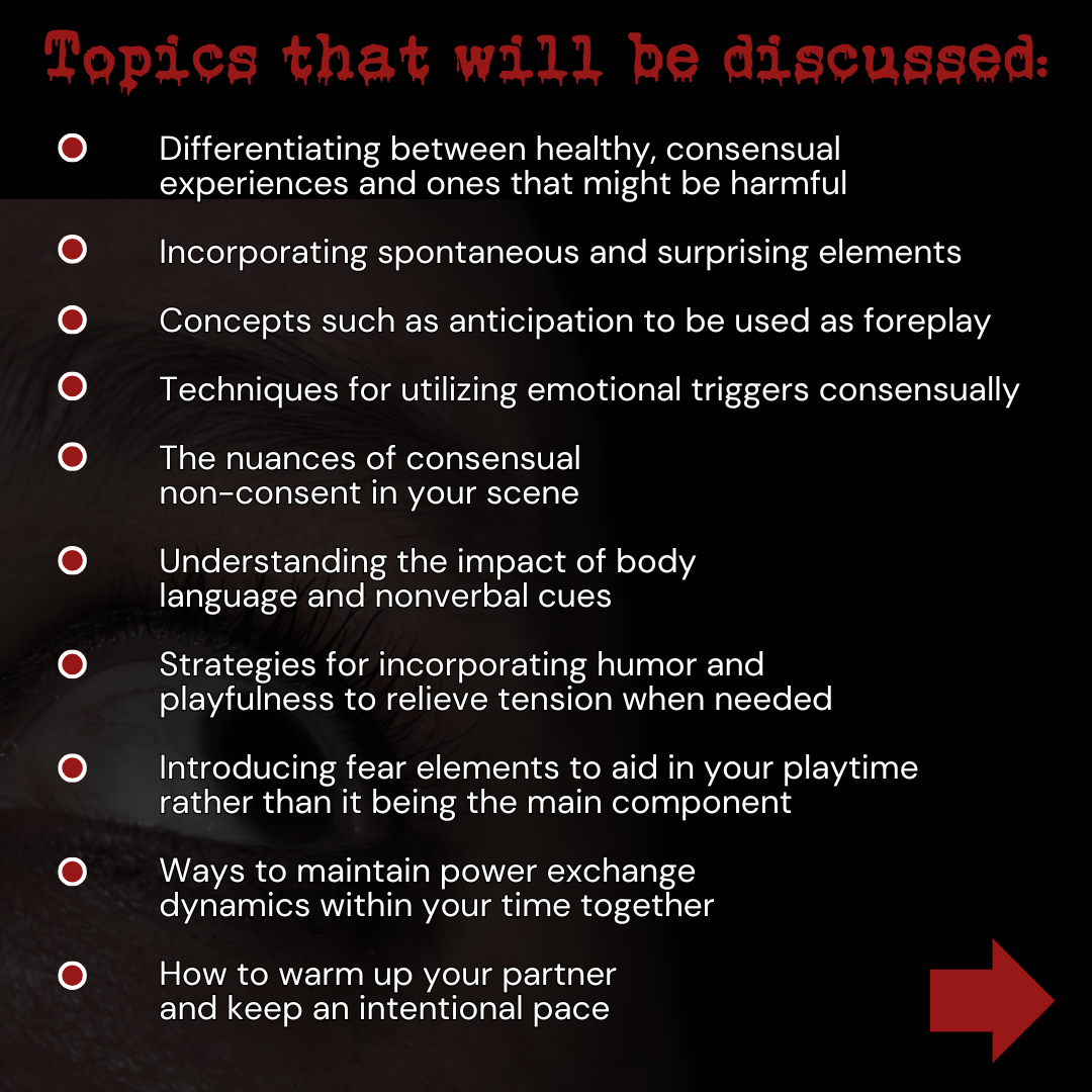 Creating a captivating and thrilling fear play experience is an intricate process that blends careful planning, strong communication, and progression, while honoring everyone’s boundaries and limits. This class is designed to introduce participants to the psychological and emotional facets, highlighting their ability to ignite arousal in the body. We will take a closer look at the physiological impacts of fear as well such as heart rate and temperature changes. Participants will learn about possible responses like fight, flight, freeze, or fawn and understand how to navigate these reactions safely, especially during the intensity of this type of scene. Key negotiation practices are emphasized, teaching participants to thoughtfully discuss which limits can be gently pushed while ensuring comfort and safety. Explore the use of verbal tactics designed to increase suspense such as a whispered threat. The course will also cover grounding techniques to help process, both during and after your time. We will go over what aftercare and debriefing can look like to ensure that everyone is well cared for. Environmental factors and how they can heighten tension will be explored, alongside practical tips on utilizing costumes and/or props to evoke specific headspace responses.