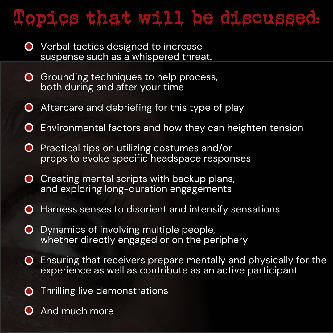 Our time includes constructing scenes with practical skills on de-escalating intensity when necessary. An essential component of the class is understanding trauma-informed practices such as recognizing and respecting personal triggers to ensure the fear play remains positive and does not unintentionally reveal past traumas. From beginners to advanced, the class covers creating mental scripts with backup plans, and exploring long-duration engagements, such as evening or weekend events. Attendees will learn to harness senses to disorient and intensify sensations. Let’s talk about the dynamics of involving multiple people, whether directly engaged or on the periphery! We will cover ways to ensure that receivers prepare mentally and physically for the experience as well as contribute as an active participant.