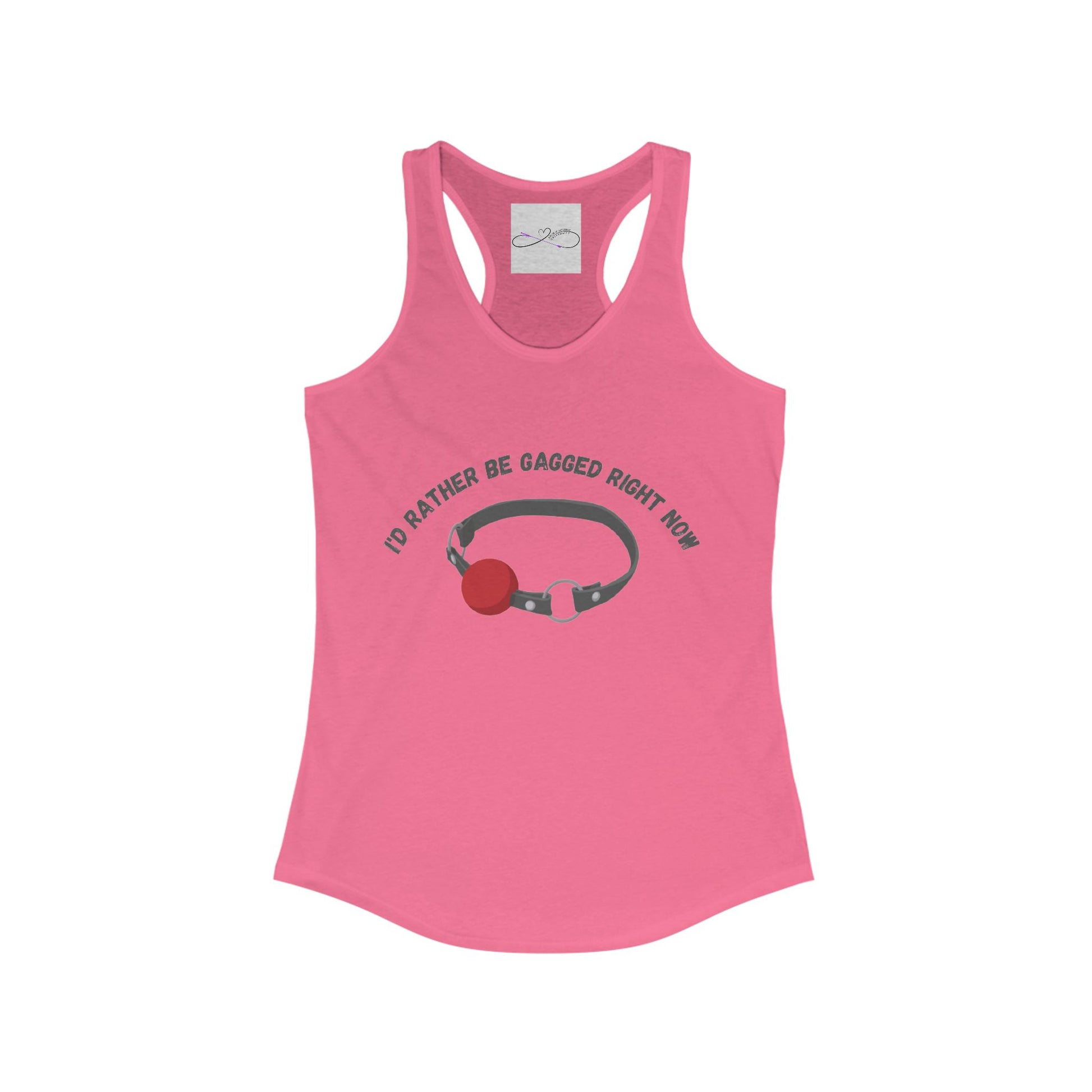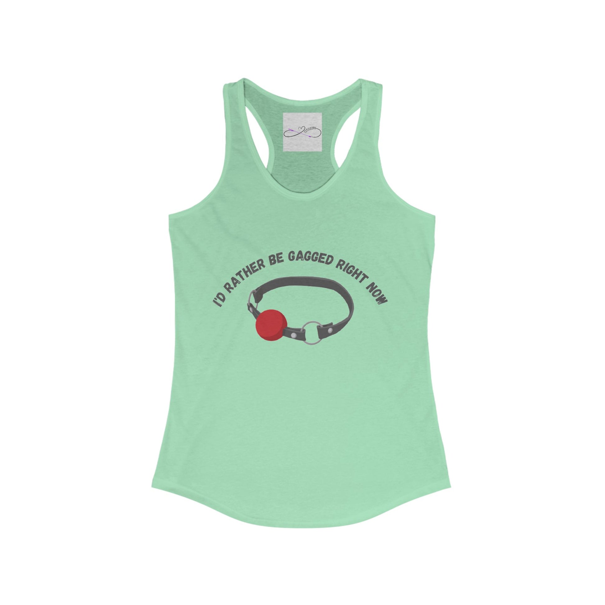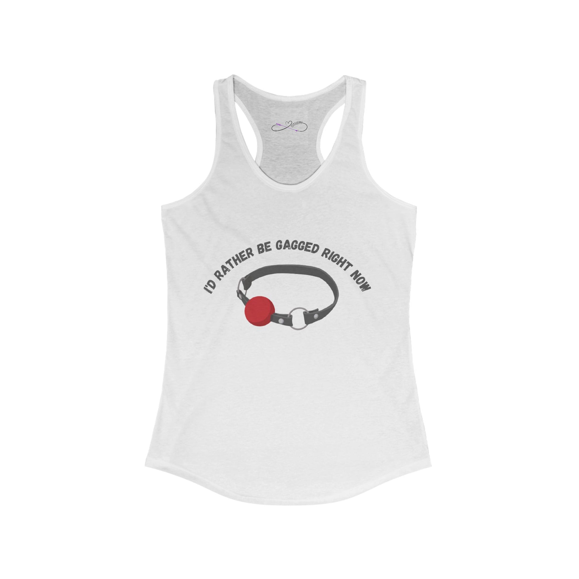 Show off your kinky pride with this tank top. The designs features a standard ball gag with the words "I'd rather be gagged right now." A high-quality print of this slim fit tank-top will turn heads. Bystanders won't be disappointed - the racerback cut looks good on any woman's shoulders.
