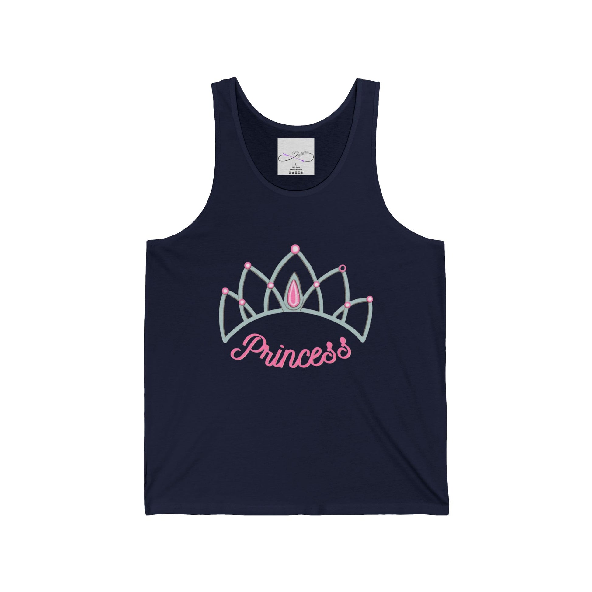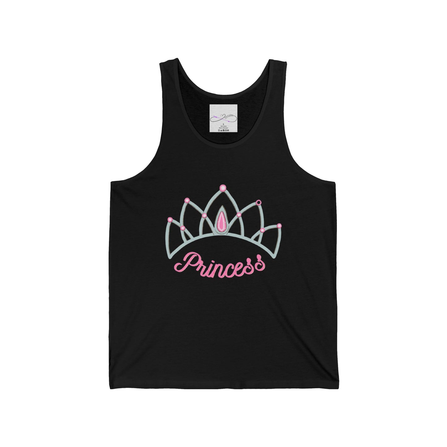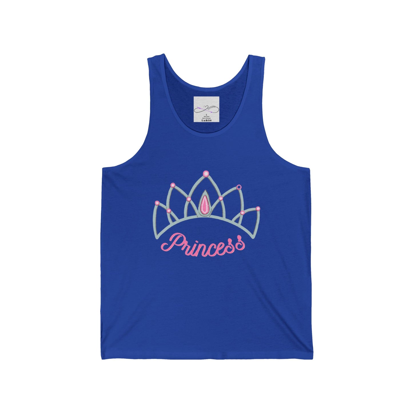 Are you a princess? Or do you have a special princess in your life? Then this design is a perfect addition. Show off your pride and let everyone know who is princess. Live your best princess life in this shirt. This must-have unisex jersey tank top fits like a well-loved favorite. High quality print makes it an ultimate statement shirt for years to come. This item has side seams to provide structural support. All bindings are the same fabric as the rest of the tank. Depending on the color, cotton, polyester, or rayon can appear.