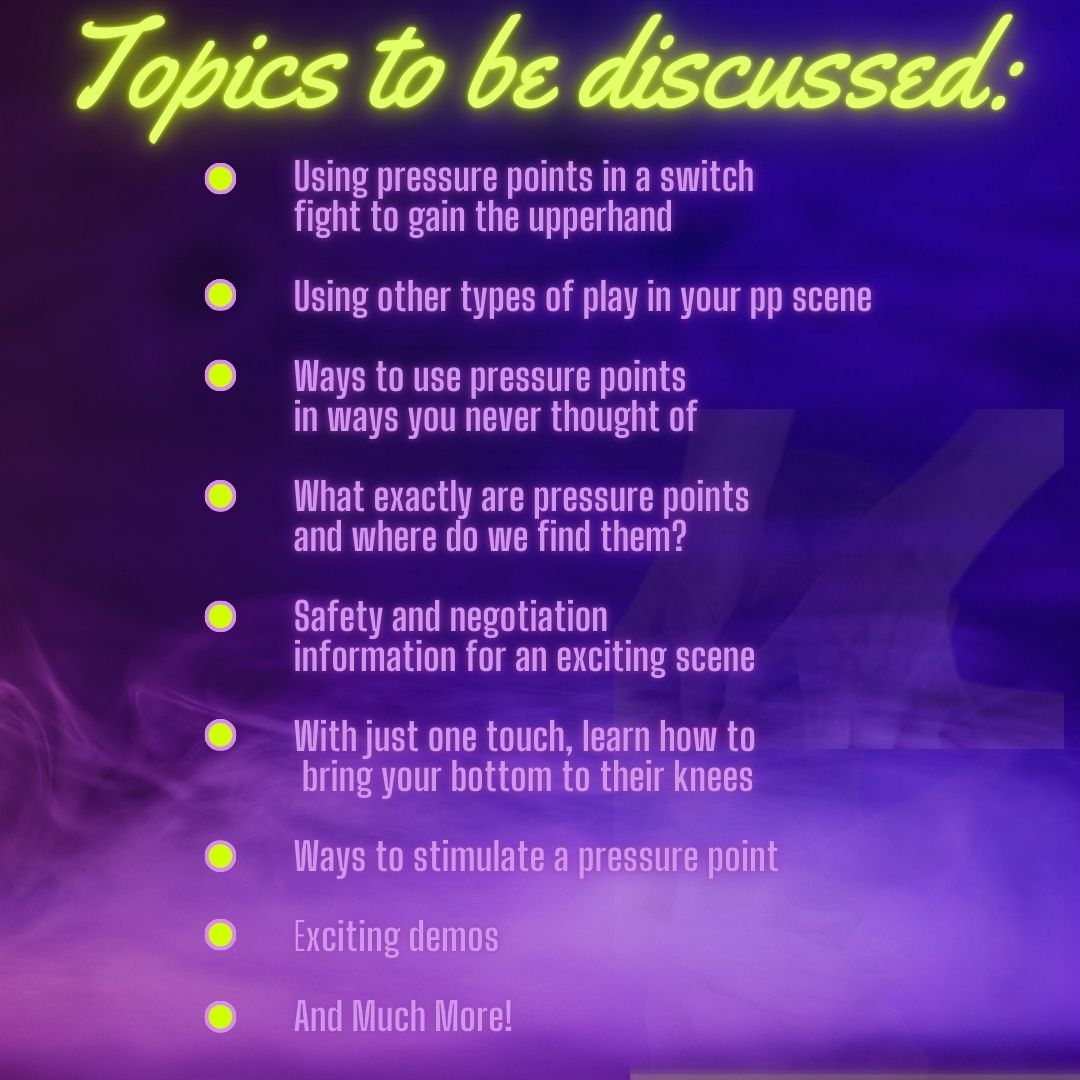 Have you ever had a really nice massage and you’ve thought about how to incorporate that into your play? Well this isn’t that class. This is designed to pinpoint those spots on the body that can cause people to crumble and move in the direction that you want them to. We will go over some ways to use pressure points in ways you never thought of. With just one touch, learn how to bring your bottom to their knees. This is a great class to get in touch with that primal energy inside yourself and use your body to inflict certain sensations with your bottom. A lot of what is covered in this class can be used in self defense as it is taught to military personnel.