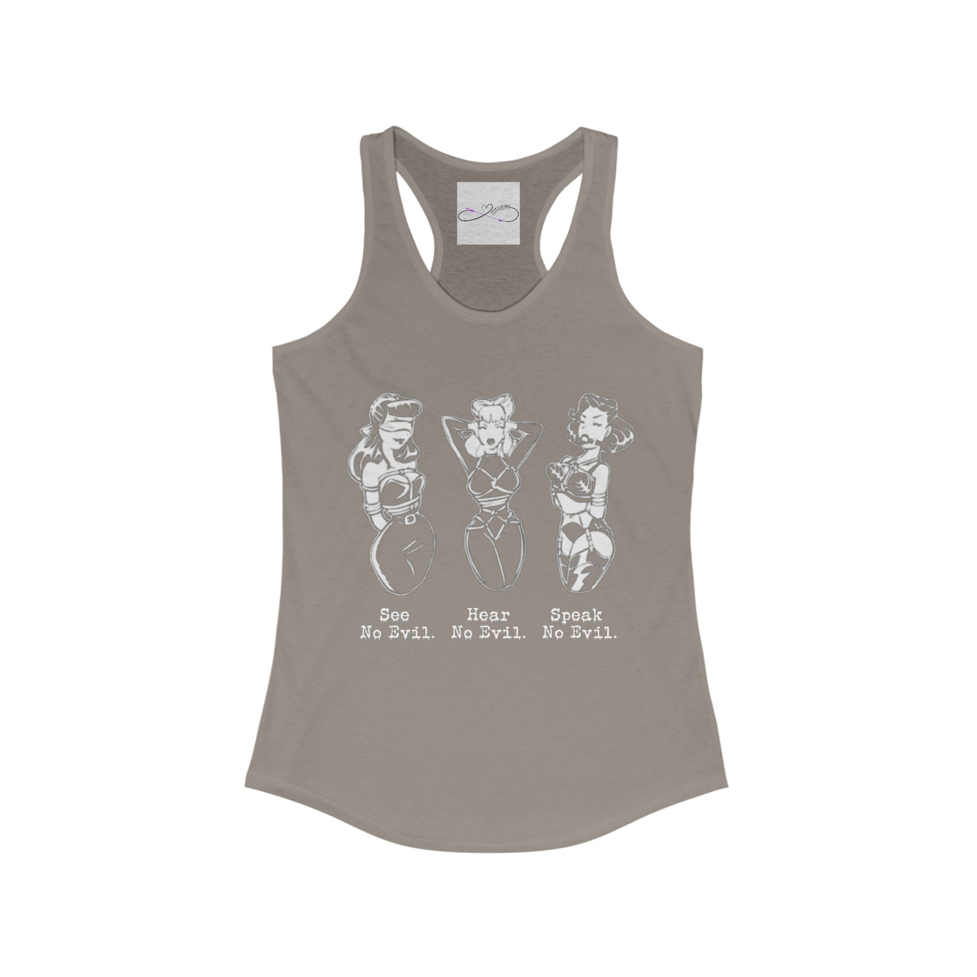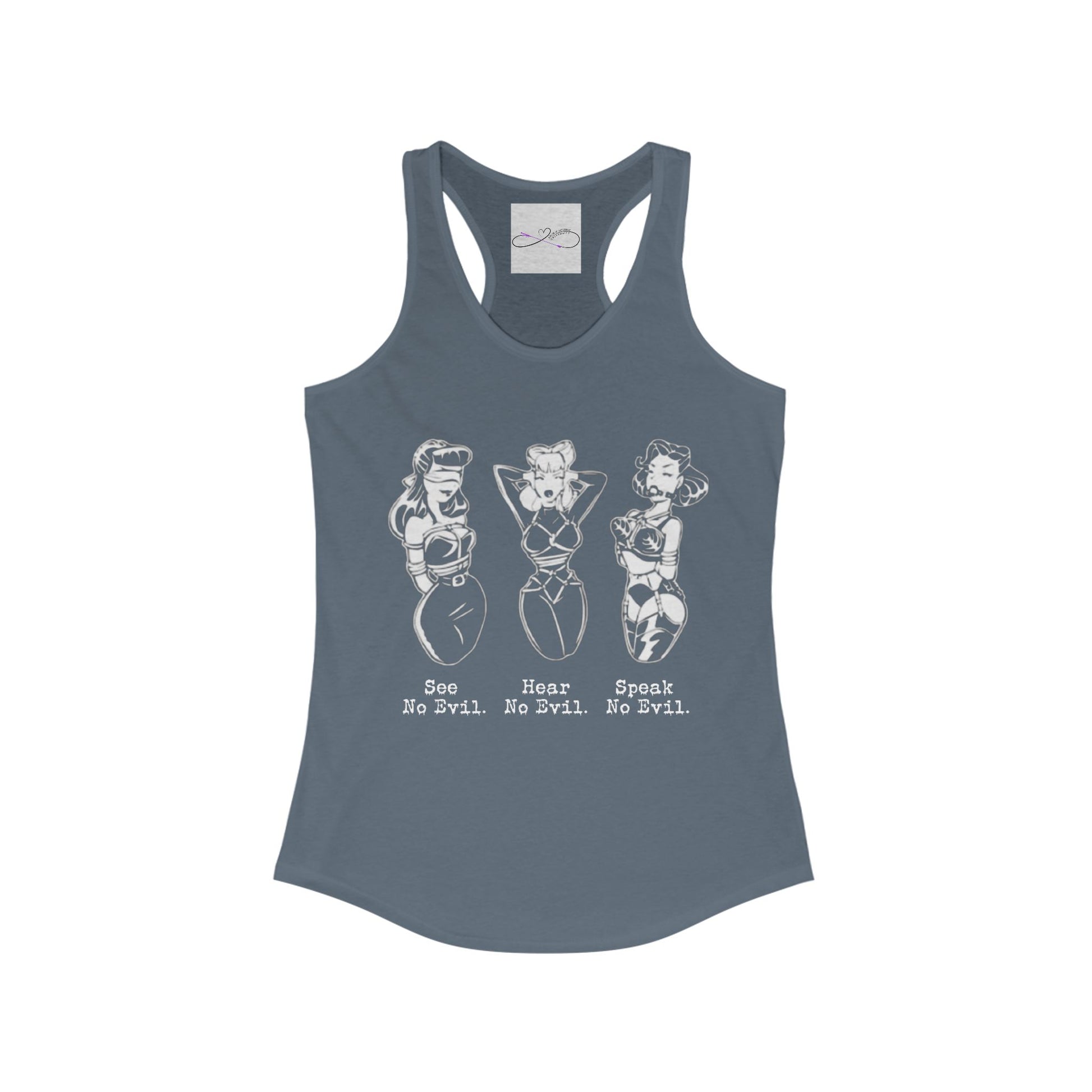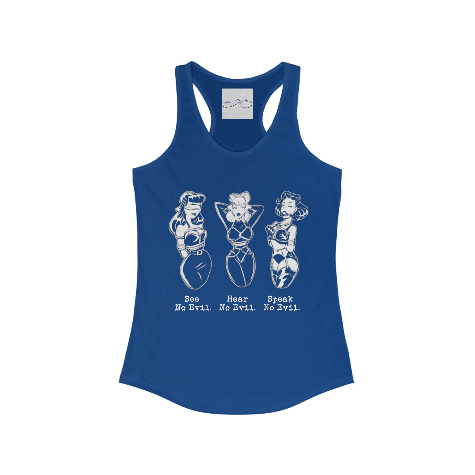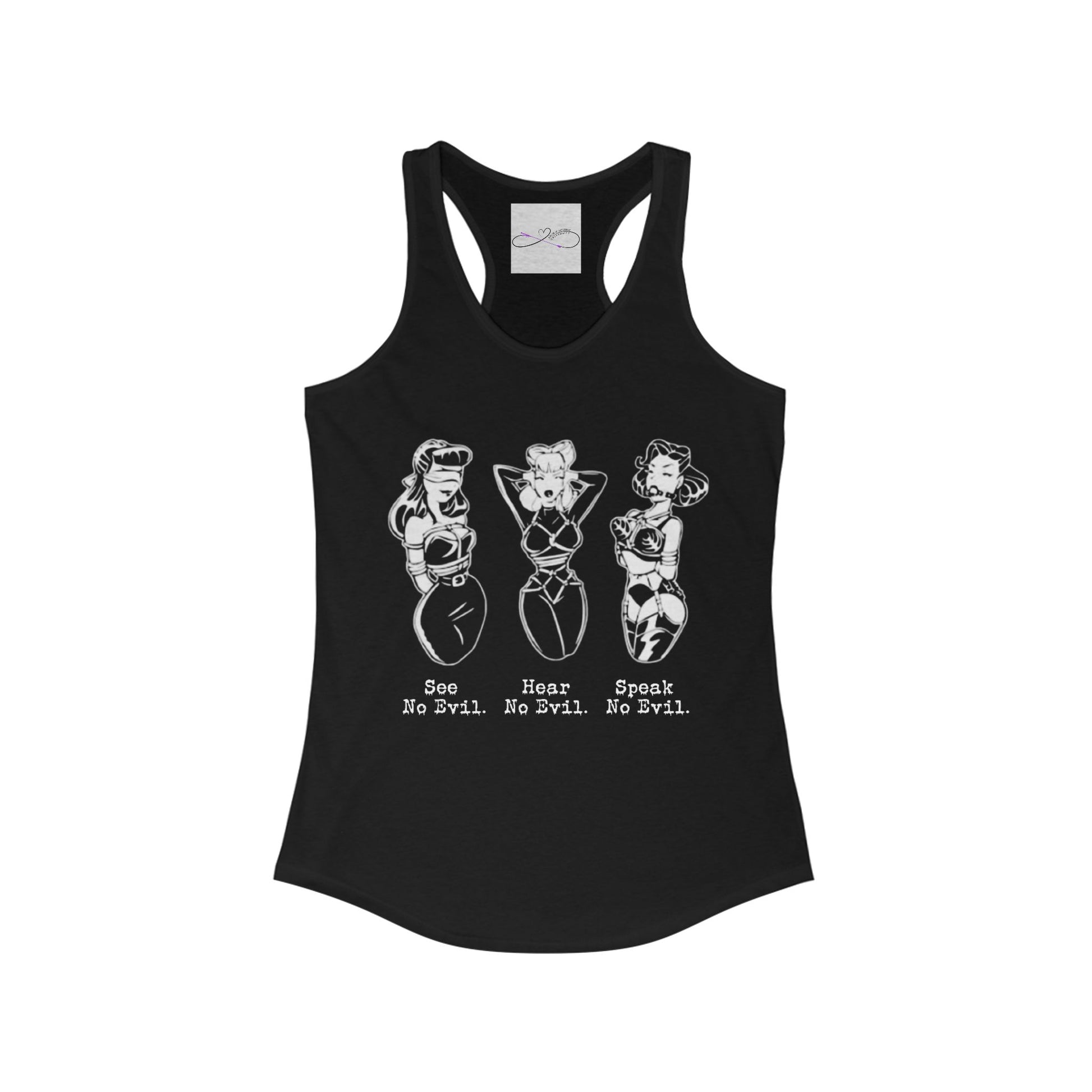 A kinky twist on the classic See No Evil, Hear No Evil, Speak No Evil saying. Add this design to your collection today! A high-quality print of this slim fit tank-top will turn heads. Bystanders won't be disappointed - the racerback cut looks good on any woman's shoulders.